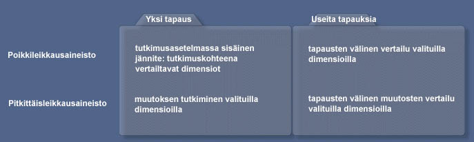 Tapausaineistot voivat olla pitkittäisaineistoja tai poikkileikkausaineistoja. Pitkittäisaineistoilla voidaan tutkia muutosta, yksikön ”elämänkaarta” ja historiaa. Tutkittavia tapauksia voi olla yksi tai useita. Mikäli tapauksia on useita, tutkimusasetelmana voi olla vertailu näiden yksiköiden välillä joillain valituilla dimensioilla. Mikäli taas tutkitaan vain yhtä tapausta, tutkimuksen kohteena voi olla sen historia, muutokset joillain mitattavilla dimensioilla, tai voidaan esimerkiksi selittää jotain ilmiötä, kuten taloudellista tulosta, joillain kohteen sisäisillä ominaisuuksilla. Tutkittavien tapausten määrän ja aineiston luonteen kaikkiaan määrittävät tutkimuskysymykset ja tutkimusasetelma. Rikas tutkimusaineisto, mikä case-tutkimuksen pohjaksi usein kerätään, antaa mahdollisuuden haastattelusiteerauksiin ja toimijan näkökulman esiintuomiseen empiirisessä tutkimuksessa. Perusteellinen case-tutkimus ei ole kuitenkaan pelkkää laveaa aineiston kuvailua, vaan johdonmukaisesti etenevä, tulkintoihin ja analyyseihin nojaava erityinen lähestymistapa. Juurtuminen teoreettiseen kehykseen onkin case-tutkimuksen haaste: selkeä käsitteellinen kehys antaa tulkintaperustan case-tutkimuksen tuloksille.