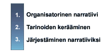 - Kolmas käyttötarkoitus tarkoittaa organisationaalisen elämän käsitteellistämistä tarinan tekemiseksi ja organisaatioteorian ymmärtämistä tarinan lukemiseksi. Czarniawska (1997) käyttää tätä kolmatta, tulkinnallista tutkimusotetta. Tässä mielessä tarkoituksenmukainen narratiivinen tutkimusote näyttäisi olevan vielä aloitusvaiheessa organisationaalisessa tutkimuksessa.