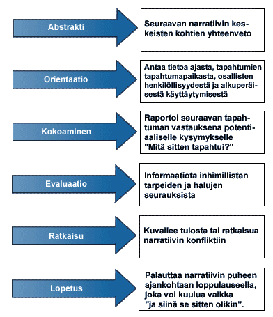 Labov & Waletzky esittävät myös seuraavan tyypillisen narratiivin rakenteen: