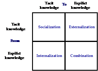 Hiljaisen ja eksplisiittisen tiedon välinen vuorovaikutus luo edellytykset osaamisen muuntamisen prosesseille ja uuden tiedon luomiselle. Tiedon luominen on spiraalinen prosessi eksplisiittisen ja hiljaisen tiedon välillä. Vuorokaikutus näiden kahden tiedonmuodon välillä johtaa uuden tiedon luomiseen. Näiden kahden tietokategorian yhdistäminen mahdollistaa asian käsitteellistämisen nelivaiheisen mallin avulla. Uuden tiedon luomisprosessit ovat sosialisaatio (socialization), ulkoistaminen (externalization), yhdistäminen (combination) ja sisäistäminen (internalization).