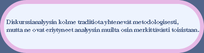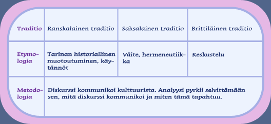 Diskurssianalyyttinen metodologia koostuu kolmesta traditiosta. Niiden syntykotien mukaan nimitän niitä ranskalaiseksi, saksalaiseksi ja brittiläiseksi traditioksi.