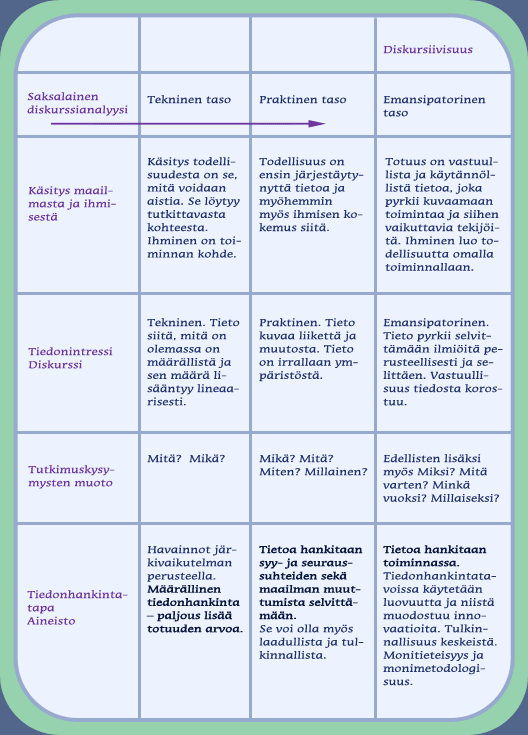 Perustelen eri koulukuntien muotoutumista jäsentämällä diskurssianalyyttiset tieteenteoriat niiden lähtökohdista käsin osoittaen, miten ne yhtenevät ja poikkeavat toisistaan. Käytän tähän tarkoitukseen Paula Kyrön kehittämää työvälinettä, jonka avulla inhimillistä käyttäytymistä tutkivia tieteen aloja ja näiden teorioita voidaan analyyttisesti jäsentää. Työvälineen keskeinen käsite paradigma kuvaa tässä yhteydessä diskurssi-käsitettä. Taso kuvaa sitä, missä ja miten tarkasteltava ilmiö on olemassa. Tätä käsitteen muodostamaa tasoa voidaan tarkastella syvemmin pyrkimällä hahmottamaan millainen maailmankuva ja ihmis- sekä tietokäsitys käsitteen merkittävyyden viestiin sisältyy. Näistä ontologiaksi nimitetään tasoa, joka kuvaa millaisena todellisuus ymmärretään ja millaisessa suhteessa ihminen on maailmaan. Tason tarkastelu johtaa epistemologisen tason käsityksiin siitä, miten tieto maailmasta ja ihmisestä on saavutettavissa. Diskurssianalyysiä ilmentävät ontologiasta ja epistemologista johdetut metodologiset ja menetelmälliset määritelmät. Nämä kuvaavat niitä periaatteita, joiden mukaan toimimalla tieto tutkittavasta kohteesta on löydettävissä.