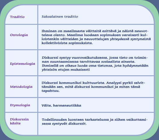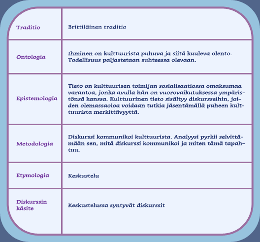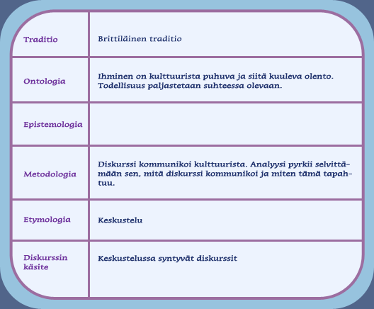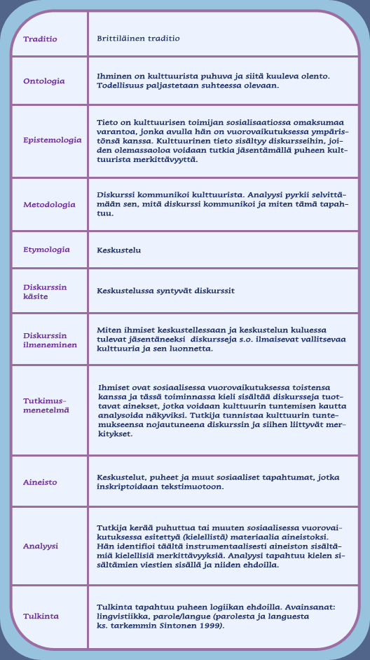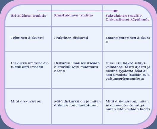 Seuraavassa taulukossa on yhteenveto eri traditioiden tuottamista käsityksistä; mitä diskurssi tarkoittaa ja miten eri tavoin se sisällyttää itsensä kulttuuriseen tietoon.