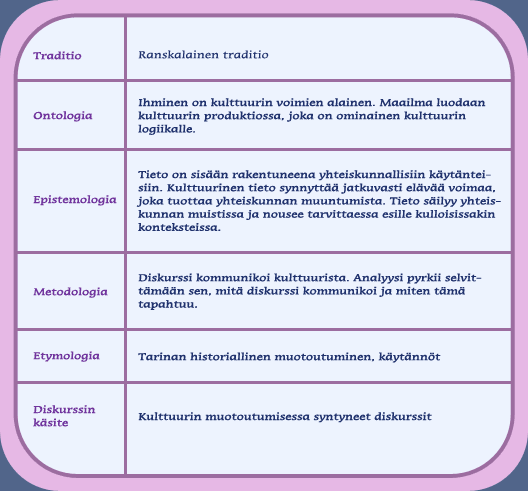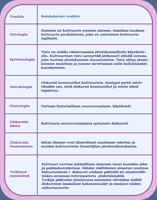 - Ranskalaisen tradition mukaan kulttuurilla on luonne, joka sitoo ihmisiä sen funktioihin. Kulttuuri pitää sisällään erilaisia diskursseja, jotka ihmiset tosin sosiaalisesti luovat mutta tässä toiminnassa diskurssit ja inhimillinen toiminta ovat alisteisia kulttuurille. Ihmiset ikään kuin joutuvat syömään keittämänsä sopan, vaikka se ei olisikaan mieleistä. Ranskalainen tapa avartaa diskurssien syntymisen ja muovautumisen logiikkaa on sikäläistä diskurssianalyysiä. Diskurssit syntyvät ja ne pysyvät yllä yhteiskunnan ja kulttuurin luomilla legitiimeillä käytännöillä, joiden olemassa olon näkyväksi tekeminen on keskeinen diskurssianalyysin tehtävä. Kun tehdään näkyväksi se, miten toiminta saa legitimiteettinsä, voidaan ymmärtää omaa roolia ja toimintaa kulttuurissa.