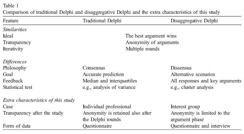 The features of the traditional Delphi and the disaggregative Delphi are summarised in Table 1. The table includes also some extra features of this study that are different from the traditional Delphi.