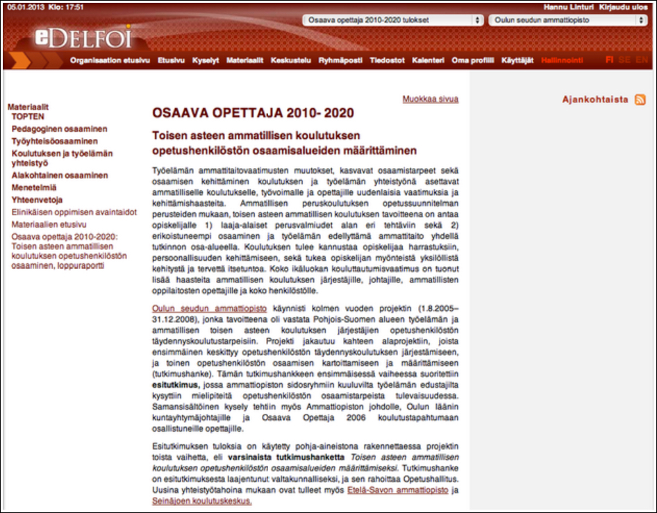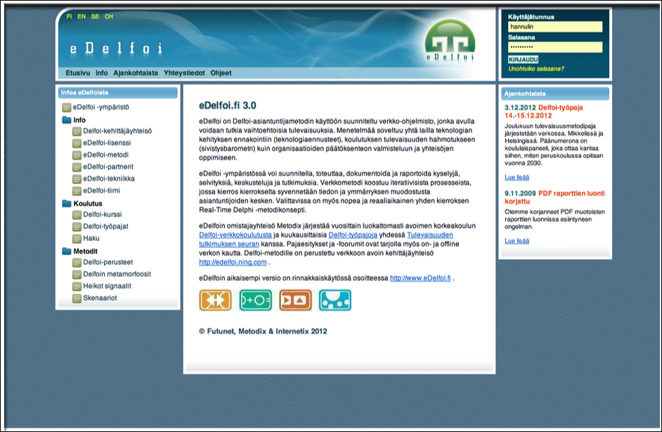 Metodikehityksen kannalta uusia aluevaltauksia mallintavat barometritutkimukset: OPH:n Oppimisen tulevaisuus 2030 (http://www.edelphi.fi/fi/groups/ot/content/index), Oulun opettaja-ammattikorkeakoulun ennakointihanke (http://www.osaavaopettaja.fi/) ja Tampereen yliopiston huumebarometri. Barometrimalliselle Delfoi-tutkimukselle luodaan kevään 2013 aikana oma verkkoympäristö. eOppimiskeskuksen Työelämä oppimisympäristönä- hanke (TYYNE http://www.eoppimiskeskus.fi/projektit/tyyne) ja kansainvälinen COST -metsätutkimus (European Forest Institute http://www.efi.int/portal/) ovat osaltaan laajentamassa menetelmäkirjoa.