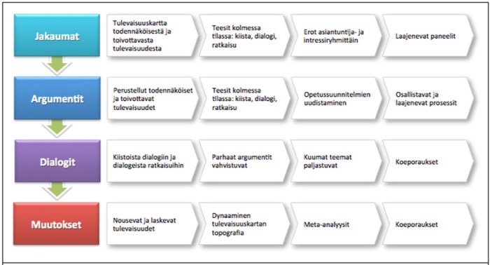 Pedagogisessa mielessä Delfoi on sokraattinen, sillä siinä kysymykset ovat lähestulkoon vastauksia tärkeämpiä, kunhan kysymyksiä ei jätetä yksikseen leijumaan ilmaan. Talousnobelisti Bengt Holmström kuvaa kysyvän oppimisen kannalta keskeisen idean selkeästi: “Yksinkertaiset kysymykset pakottavat ajattelemaan asioita uudella tavalla ja ohjaavat tutkimusmatkoille, joiden päätepiste on aluksi tuntematon.” Kysymykset kohdistuvat tarkasteltavan ilmiön – tässä tapauksessa ilmastonmuutoksen – tulevaan kehitykseen. Valintoja arvotetaan sillä, missä määrin ja laaduin niiden taakse kertyy perusteluja eli argumentteja. Erilaisuutta arvostava keskustelu on keino argumenttien seulomiseen. Dialogin kautta vastaajat määrittelevät tulevaisuusvaihtoehtoja, joista on mahdollista tarinallistaa skenaarioita eli polkuja tästä hetkestä tuleviin tiloihin.