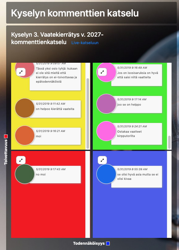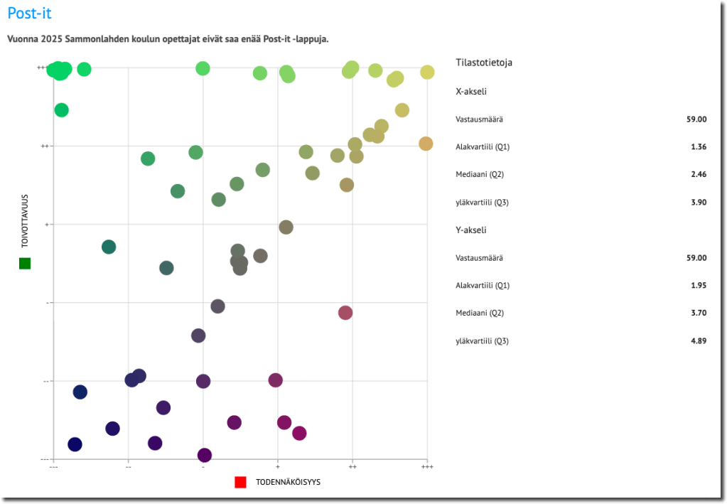 Kaikki Delfoi-paperissa kuvatut äänestyskysymykset ovat esimerkinomaisia ja ne voi korvata omilla. Koko setin voi porskuttaa läpi kerralla tai tehdä jutusta jatkosarjan, jossa joka kertaa avataan uusi näkökulma siihen miten me yksilönä ja yhteisönä muodostamme kantaa asioihin ja ilmiöihin. Äänestyksen analyysissä kannattaa havainnoida alaryhmien välisiä eroja kuten poikia (keltainen), tyttöjä (vihreä) ja opettajia (oranssi). Äänestyksen tuloksia on mahdollista tarkastella matemaattisten ja tilastollisten tunnuslukujen kautta kuten edellä todettiin. Keskiarvo, hajonta ja vaihteluväli voidaan laskea vastaajien sijainnin mukaan. Tarkka laskeminen edellyttää analogisten äänien koodaamista kahden asteikon koordinaatistoon. Senkin voi äänestysalueesta tunnistaa, että vastaajajoukon voi jakaa neljään eri ryhmään (nelikenttä) sen mukaan, miten he vastaavat kahden kriteerin mukaan.