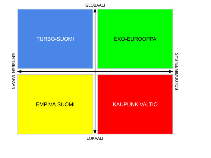 - TULEVAISUUS: tutkimisen kohteena ovat mahdolliset tulevaisuudet, joita oletetaan olevan monta, erilaisia mahdollisuuksia kuvaavat skenaariot ovat tulevaisuuden käsikirjoituksia