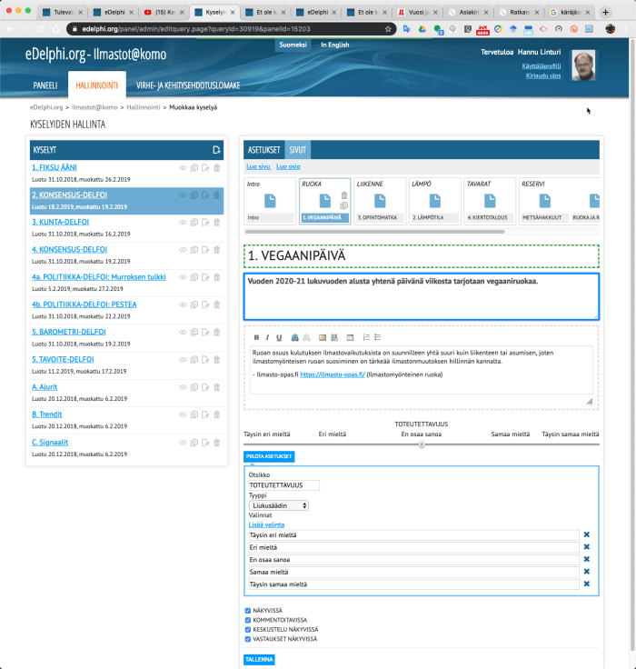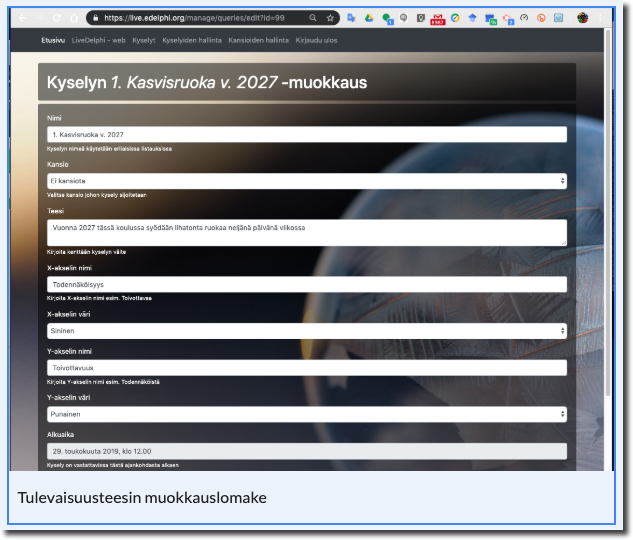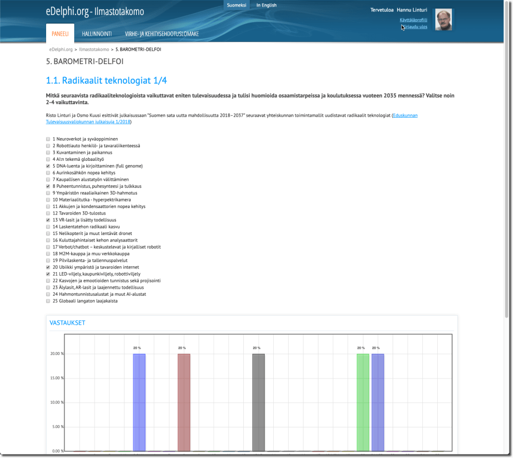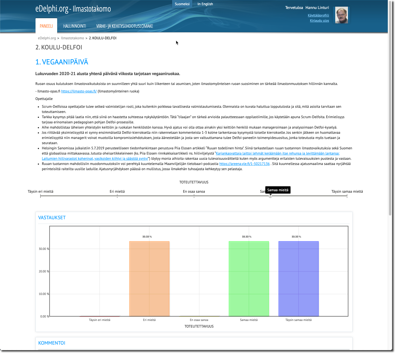 eDelphi-verkko-ohjelmisto on avoin kysely- ja oppimisympäristö, joka löytyy osoitteesta https://www.edelphi.org/ilmastotakomo . Sekä opettajat että opiskelijat voivat rekisteröityä siihen omin tunnuksin.