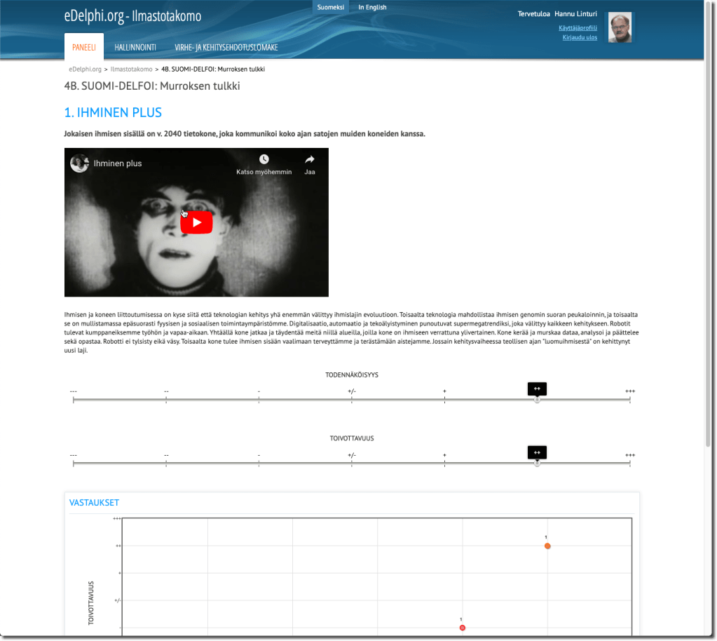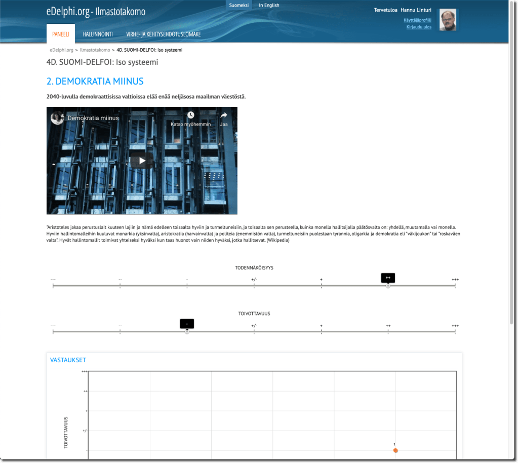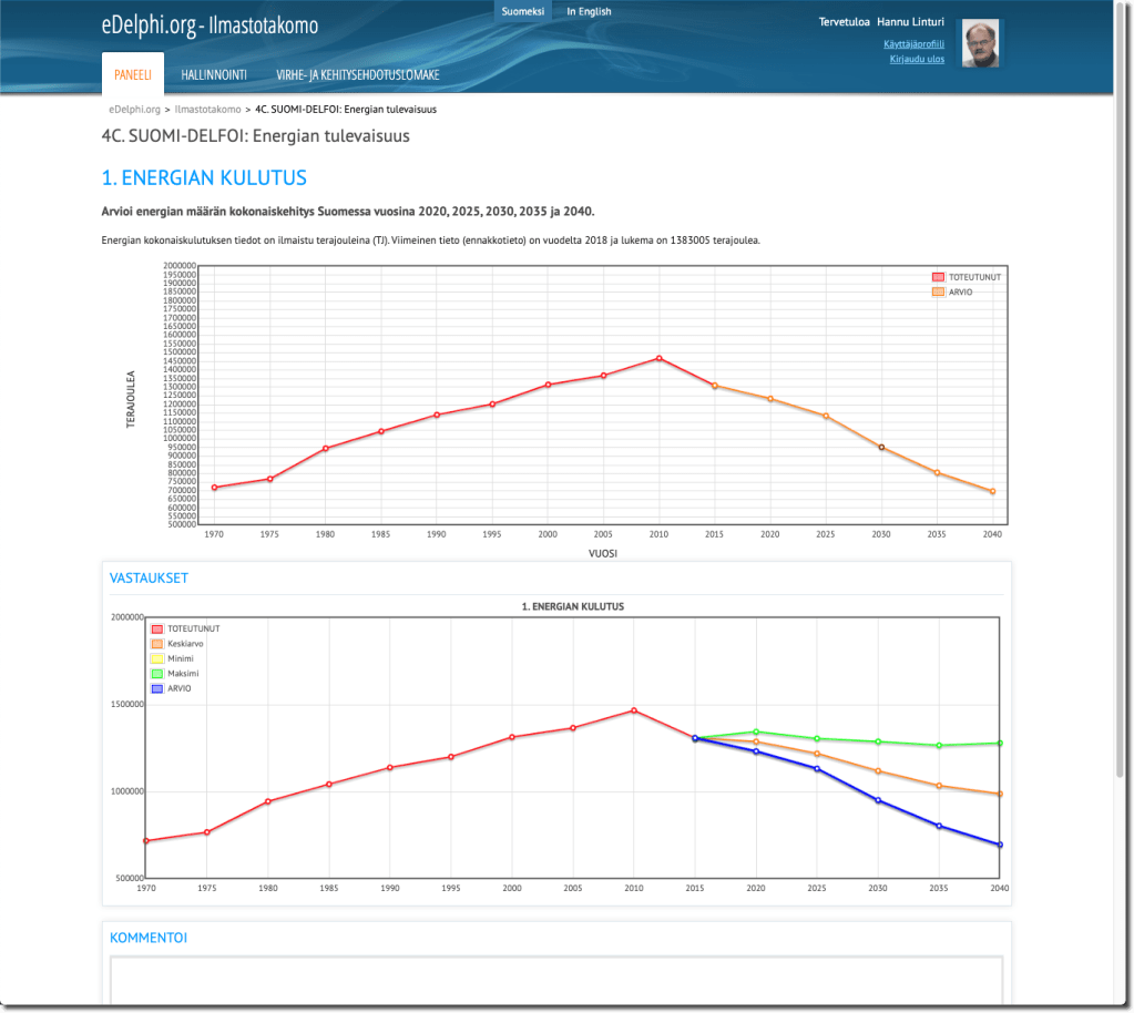 - “SUOMI-DELFOI” -jaksossa tutkiminen laajenee koko maahan ja haluttaessa koko maapalloon. Ilmastotulevaisuutta tutkitaan tavalla, jossa muodostetaan skenaariopolkuja erilaisiin tulevaisuuksiin. Skenaarioista rakentuu tulevaisuuskartta, jonka dynamiikkaa syvennetään energiatulevaisuuden laskentamallilla. Menetelmällisesti on kyseessä ns. Politiikka-Delfoi-variaatio, jossa tutkitaan ilmastonmuutosta tavalla, jossa ei pyritä ensisijaisesti yksimielisyyteen vaan löytämään perusteluja ja malleja erilaisille mahdollisille tulevaisuuksille. Nämä tulevaisuudet jalostetaan ja tarinallistetaan skenaarioiksi. Syvätavoite on oppia tutkimaan ja vaikuttamaan yhteiskunnan toimintaan.