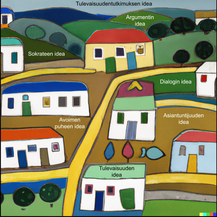 Pyysin tekoälyltä avuksi naivisti Grandma Moseksen, joka maalasi ideoiden kylän, jossa jokainen idea asuu omassa talossaan, mutta on tekemisissä kaikkien naapureidensa kanssa. Analogia virittyi tunnetusta hokemasta, jonka mukaan” koko kylä kasvattaa”. Kun yksi naapuri onnistuu esittämään toiveikkaan väitteen kylän kehityksestä, toinen naapuri lähtee kehittämään sitä, ja kolmas keksii vielä lisää perusteluja sille, että visio voidaan toteuttaa. Neljännellä on kyky toteuttaa hanke, kunhan viides onnistuu tempaamaan nekin mukaan, jotka aluksi empivät. Hyvässä kylässä tulevaisuus tehdään, ja siihen löydetään sopivat työkalut. Kylä askeltaa myönteiseen kierteeseen, jossa sen sosiaalinen ja intellektuaalinen pääoma karttuu nopeammin kuin mikään inflaatio.