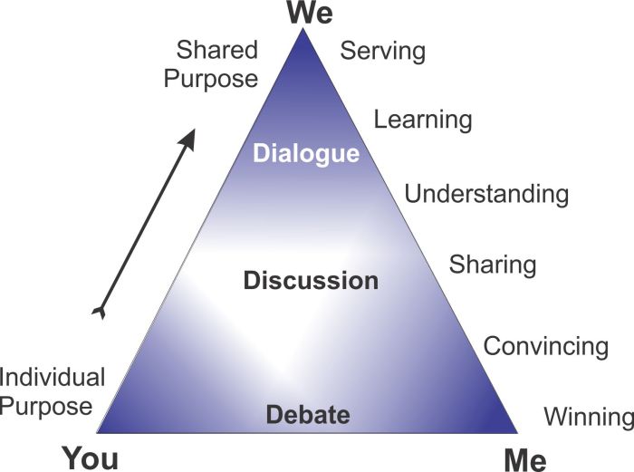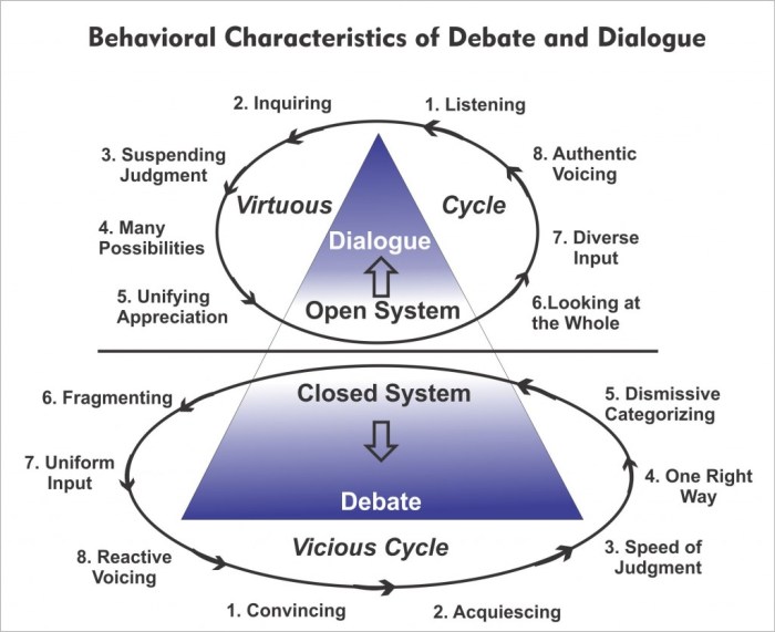 Kakkosartikkelissa Dialogin idea erotettiin toisistaan debatti, dialogi ja keskustelu (discussion). Debatti on sanallinen ”taistelu”, jonka tavoitteena on voittaa vastustaja asiasta tai aiheesta riippumatta. Dialogi on sen vastakohta, jossa pyritään kuuntelemalla ja omien käsityksen muotilulla toisen ymmärtämiseen. Dialogi on myös eri asia kuin keskustelu, jossa päinvastoin kuin dialogissa asiat, aiheet ja motiivit rönsyilevät yksilöiden ja tilanteiden jatkumossa. Eduskunnan suuren salin istunnot käyvät esimerkiksi määrämuotoisesta keskustelusta, joka koostuu nopeatempoisista, vaikuttamaan pyrkivistä ja argumenttipitoisista puheenvuoroista, joilla yritetään vakuuttaa yleisö ja muut keskustelijat oman näkökulman oikeutuksesta. Sosiaalisen median säätelemättömät alhaalta ja reunoilta rönsyävät keskustelut ovat usein kaaottisia ja hallitsemattomia tavalla, jossa dialogia ei juurikaan esiinny. Tämän ajan demokratian haaste on avoimen puheen dialogisoiminen. Sopivia ajankohtaisia ja kuumia kysymyksiä riittää koulukäyttöönkin.