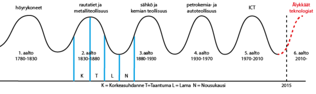 Kondratieffin kuudetta aaltoa muovaavat älykkäät koneet. Kone- ja bioteknologian innovaatiot ja ratkaisut auttavat ihmisiä siellä missä lajikyvyt loppuvat. Mielenkiintoinen apukäyrä Kondratieffin aaltoihin tulee Gartnerin tutkimuslaitokselta. Se on diffuusiotutkimuksissaan tunnistanut teknologiainnovaatioihin liittyvän odotusten nopean (eksponentiaalisen) nousun, jota seuraa melkein yhtä nopea romahdus, kun liiketoiminta ei toteudu toivotulla tavalla. Pysyvä muutos tapahtuu vasta hypevaiheen jälkeen. Olennaista on että muutos on lopulta todellinen, joskin se saattaa toteutua alemmalla tasolla kuin alkuperäinen odotus.