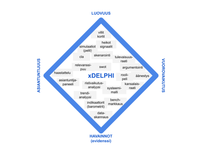Delfoi-metodi on merkitty timantin keskustaan xDelphi-nimellä, joka on Delfoi-menetelmän käyttöön suunniteltu ohjelmisto. Foresight Diamond by Rafael Popper 2008, Metodix-sovellus Hannu Linturi.