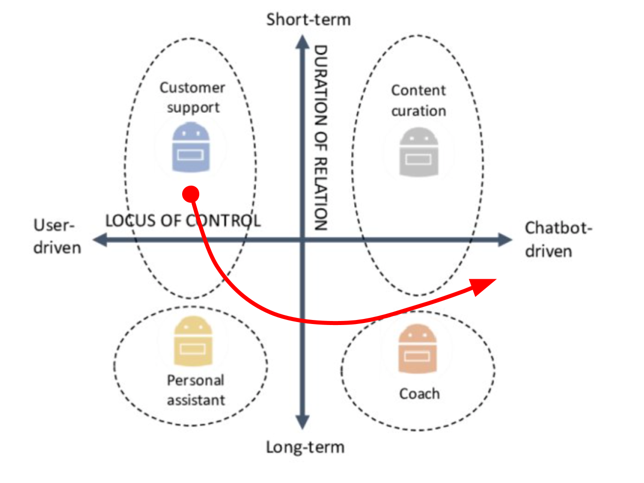 Kari A. Hintikka on Delfoin tekoälypanelistin käyttöä testaavissa tutkimuksissaan hyödyntänyt Følstadin chatbot-luokittelua. A typology of chatbots with four example chatbot purposes located within the typology dimensions (ks. Asbjørn Følstad).