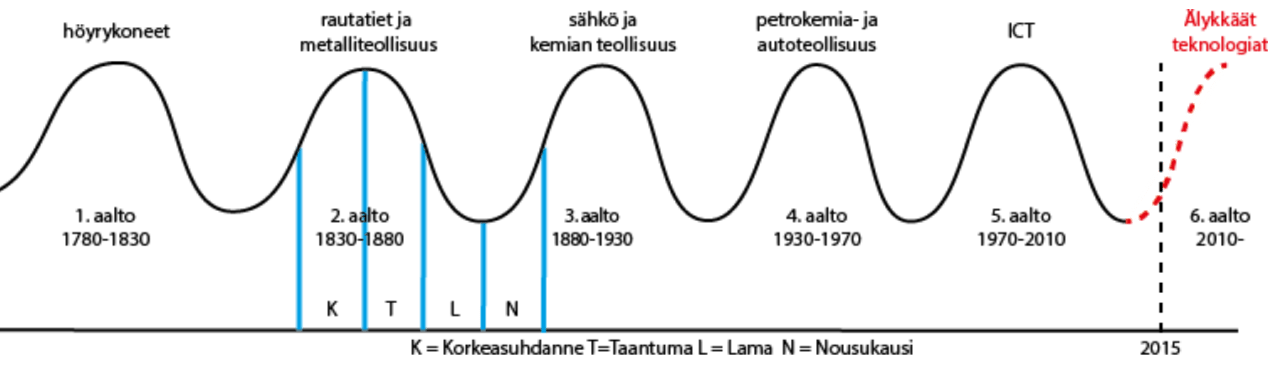 Ensimmäinen sykli käynnistyi 1780-luvulla höyrykoneen keksimisen myötä. Se mahdollisti poikkeuksellisen tuottavuuden lisääntymisen, joka vauhditti ensimmäisen aallon jyrkkään nousuun. Toinen sykli käynnistyi 1830-luvulla rautateiden ja terästeollisuuden kehityksen kautta. Tavara ja ihmiset liikkuivat paikasta toiseen aiempaa paljon vauhdikkaammin. Sähköistyminen kiihdytti kolmatta aaltoa kemianteollisuuden ohessa, joka lisäsi tuottavuutta etenkin maataloudessa ja lääketieteessä. Tämä aalto törmäsi 30-luvun suureen lamaan, josta noustiin neljännen aallon harjalle petrokemian ja autoteollisuuden myötä. Öljykriisi taittoi talouden seuraavaan syöksyyn, jonka montusta noustiin viidennen aallon ja informaatioteknologian avulla. Sen vauhti hiipui hetkellisesti hiipui finanssikriisin takia, jonka jälkioireissa Wileniuksen ja Kurjen mukaan edelleen osittain eletään. Laskevaan aaltoon osuivat poliittiset levottomuudet, jotka ovat uuteen nousuun kääntymisen jälkeenkin jatkuneet.